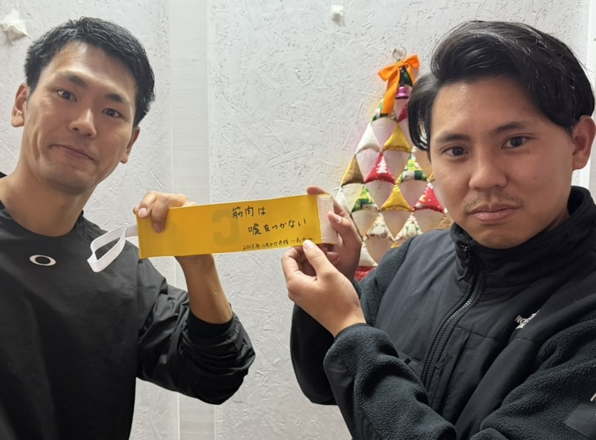 パーソルナルトレーナージム開設という夢をかなえるため、新しいステージへと旅立つフットサル部(こころHSFC)の川島くんより、フットサルボールとホイッスル、そしてキャプテンマークを寄贈いただきました。こころHSFCにとっては初めてとなるキャプテンマークであり、その内側には力強いメッセージが刻まれていました。